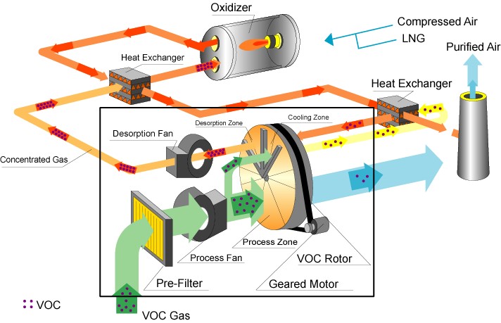 沸石作为一种天然的硅铝酸盐成分,其材料表面有很多孔隙结构,对voc具有吸附作用,将精致筛选后的沸石材料通过特殊工艺涂覆在蜂窝基材表面后,形成了可以用于废气吸附过滤净化的特殊型材,具有很好的疏水性和不燃性,做成转轮设备后可以连续处理车间排放的有机废气,吸附脱附或者还有冷却同时连续进行,当转轮进入脱附区域后,一定温度的热空气对沸石材料进行脱附,脱附后的混合气做氧化燃烧处理
